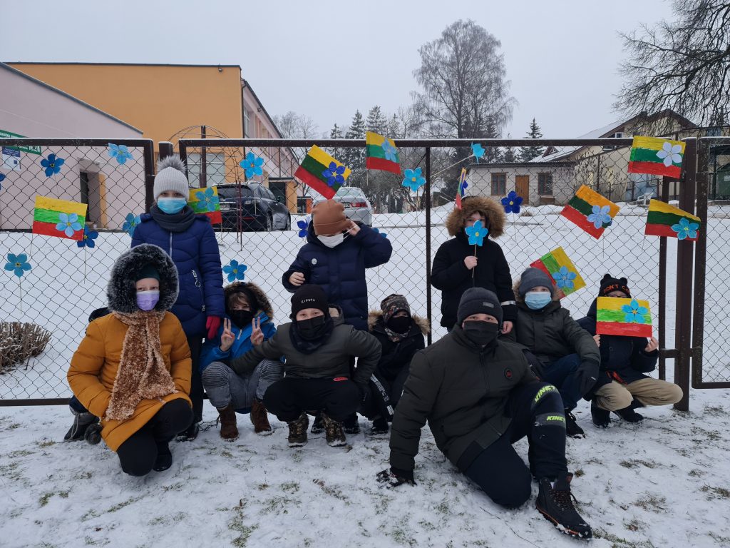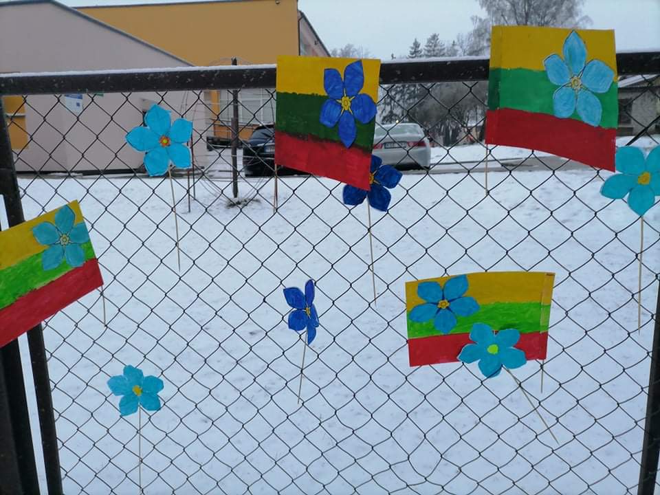 1b klasės mokiniai su mokytoja Janina darė trispalves puoštas Sausio 13-osios simboliu – ,,Neužmirštuolės žiedas”.