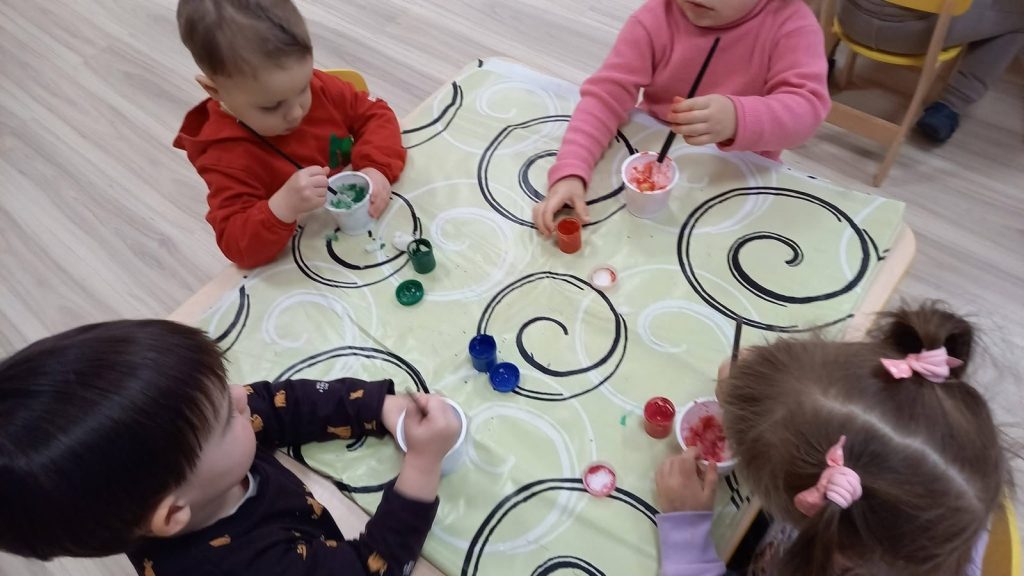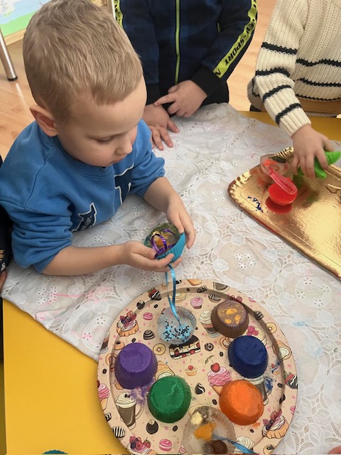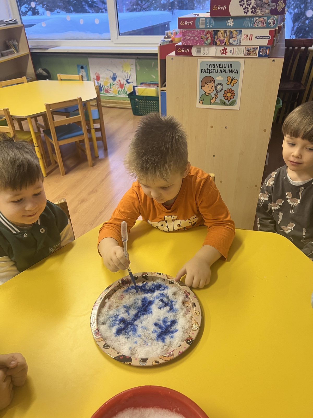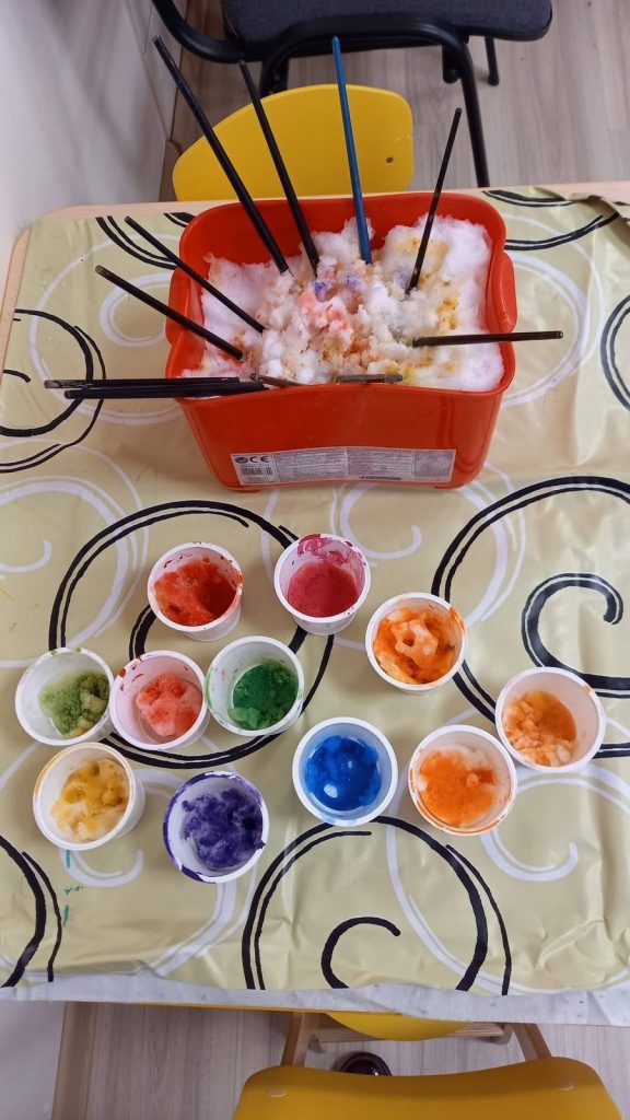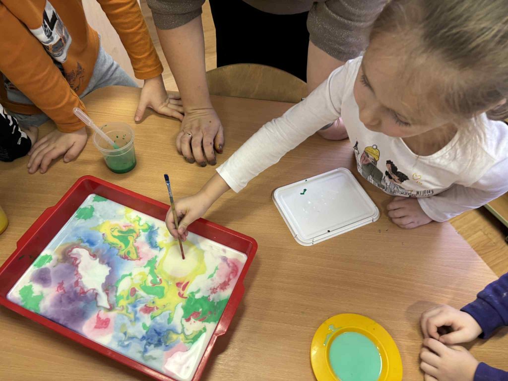Tyrinėdami vandenį ir ledą , stebėjome, kaip keičiasi jų būsenos, supratome, kas nutinka šilumai susitikus su šalčiu. Spalvų maišymas virto tikru stebuklu – vaikai patys atrado, kaip iš pagrindinių spalvų gimsta naujos, netikėti atspalviai. Didelį susižavėjimą sukėlė ir kristalų auginimas – kantriai, žingsnio po žingsnio stebėjome, kaip iš mažų dalelių formuojasi spindintys kūriniai.