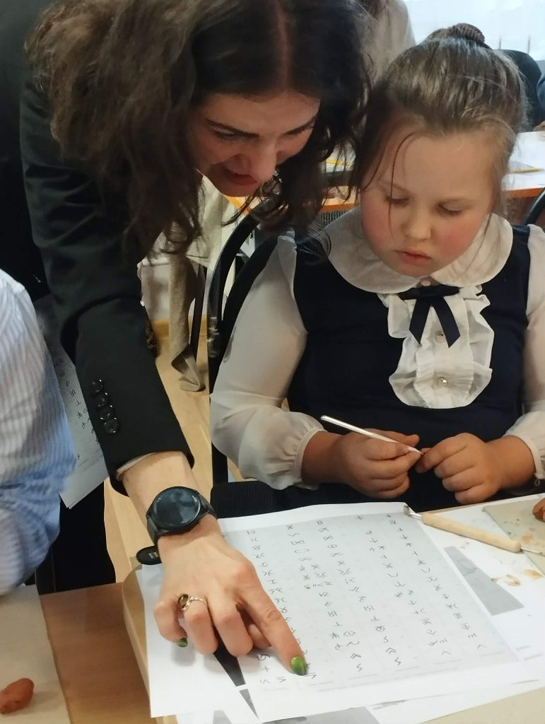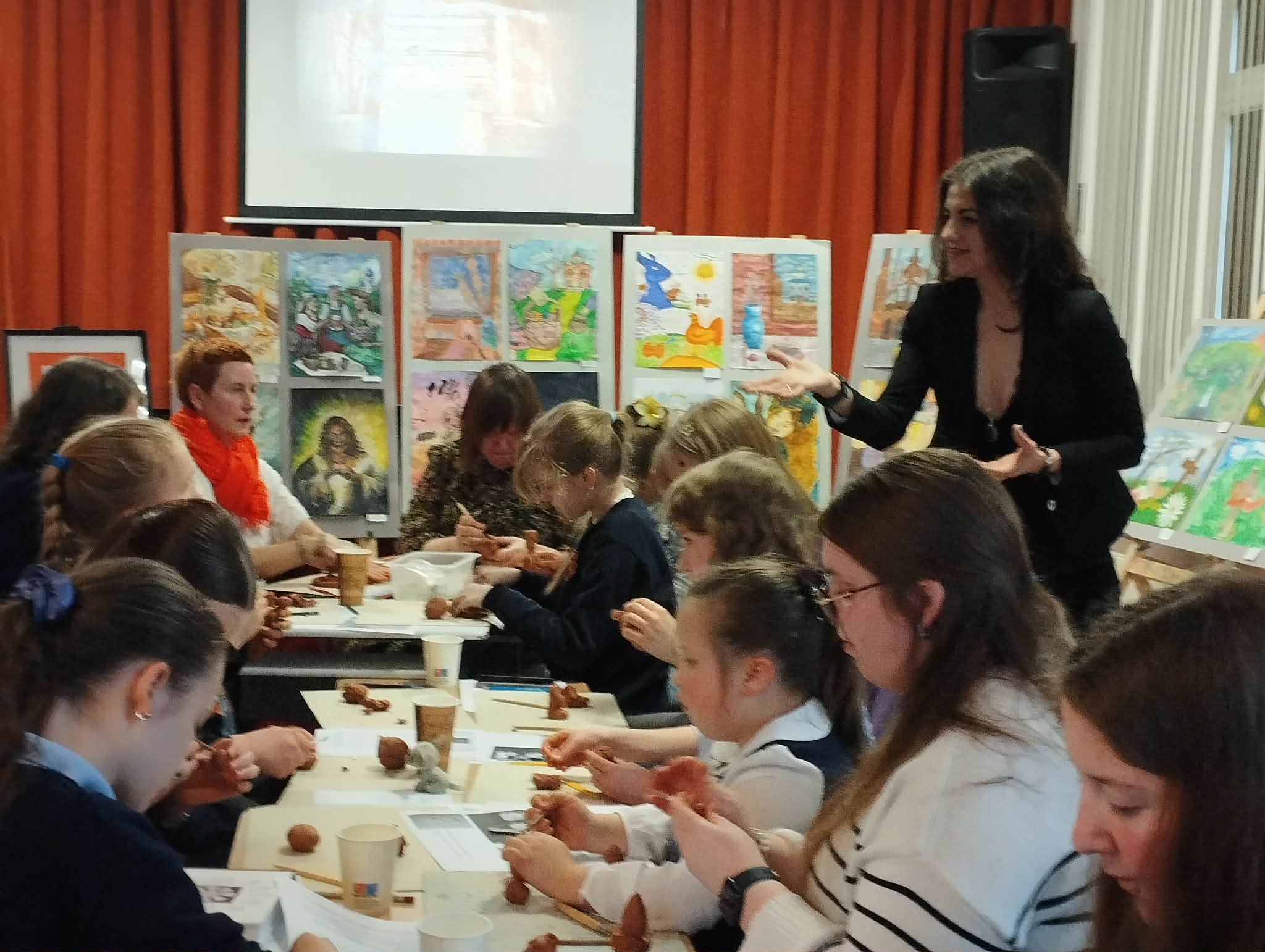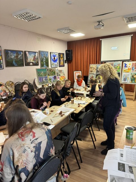 Po uroczystości wręczenia dyplomów mieliśmy okazję wziąć udział w warsztatach twórczych prowadzonych przez malarkę Krystynę Kurelionok. Artystka zaprezentowała swoją twórczość, a następnie zaprosiła uczestników do stworzenia glinianych artefaktów inspirowanych postaciami bogiń. Proces twórczy okazał się niezwykle wciągający i ekscytujący.