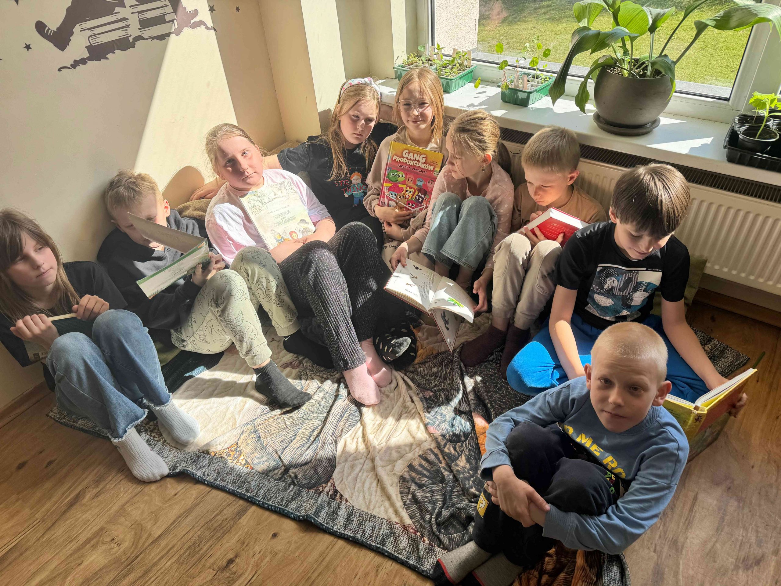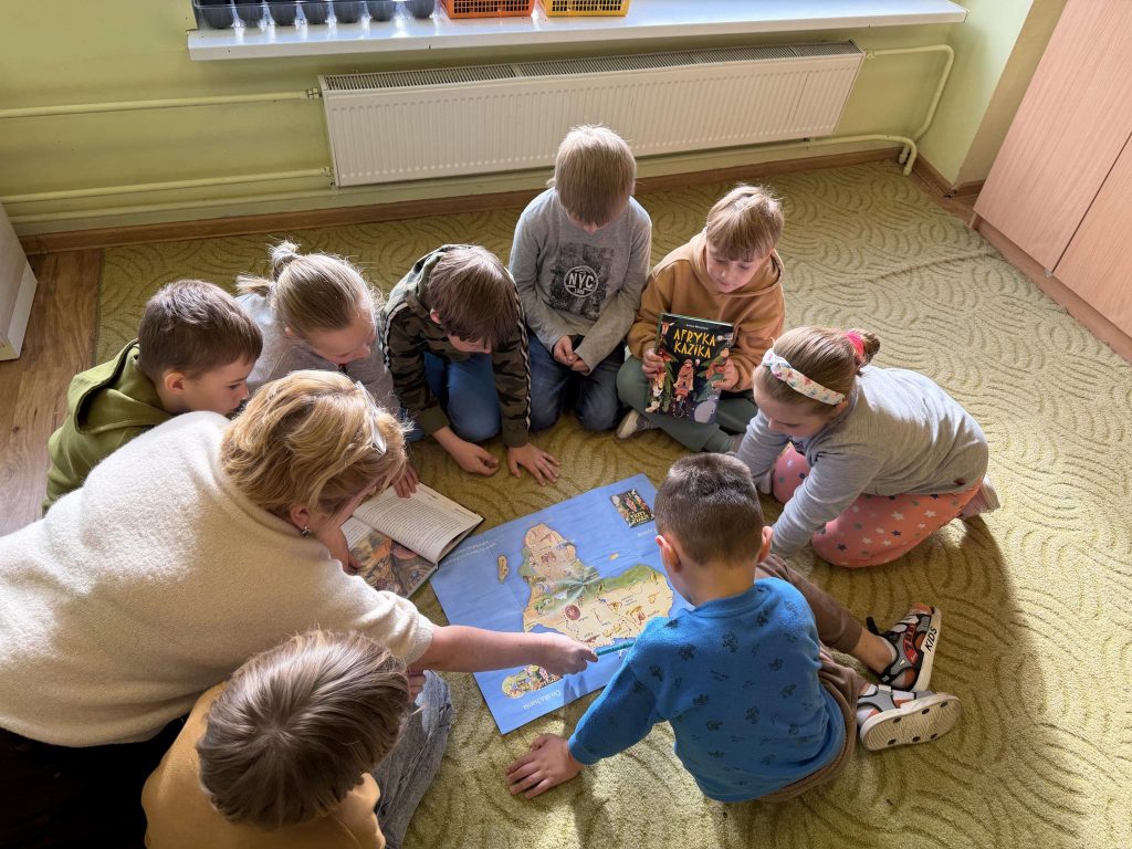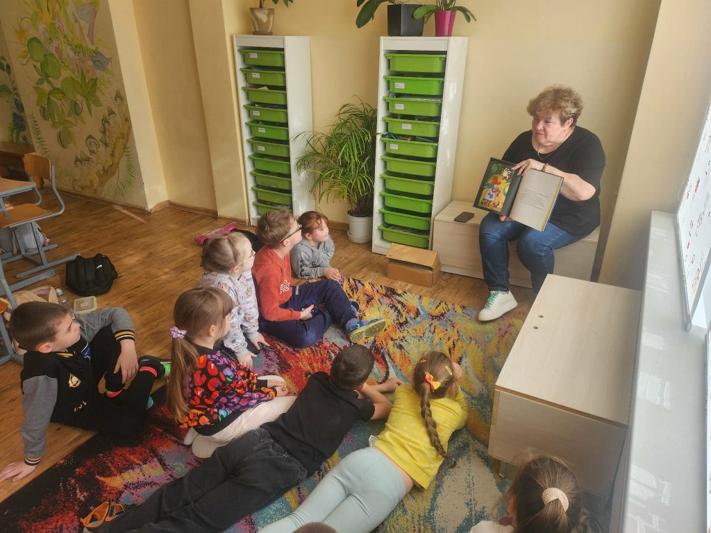 Zajęcia odbywały się w ciepłej i przyjaznej atmosferze – uczniowie siedzieli razem na dywanikach w kręgu, co sprzyjało rozmowie, wymianie opinii i budowaniu wspólnoty czytelniczej.