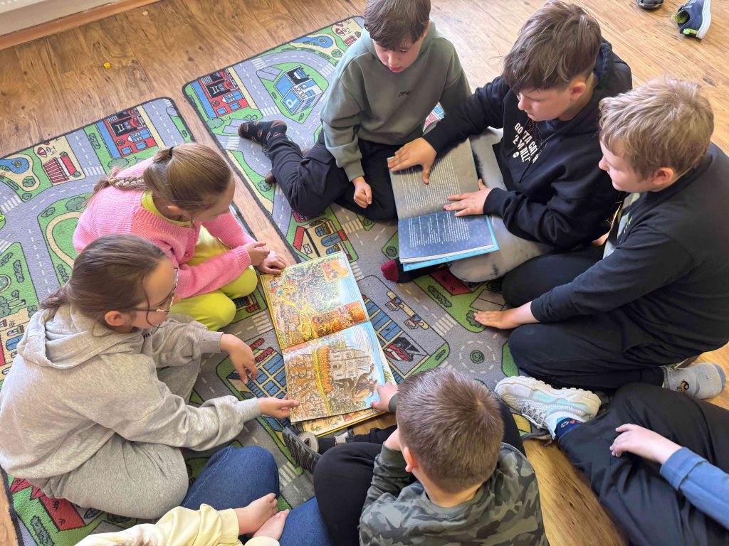 Nie zabrakło również kontaktu z literaturą w praktyce – dzieci wspólnie czytały fragmenty książek oraz analizowały ilustracje, rozwijając wyobraźnię i umiejętność interpretacji. Szczególnym zainteresowaniem cieszyły się prezentacje książek przyniesionych przez uczniów, którzy z dumą opowiadali o swoich ulubionych tytułach.