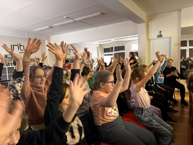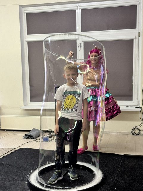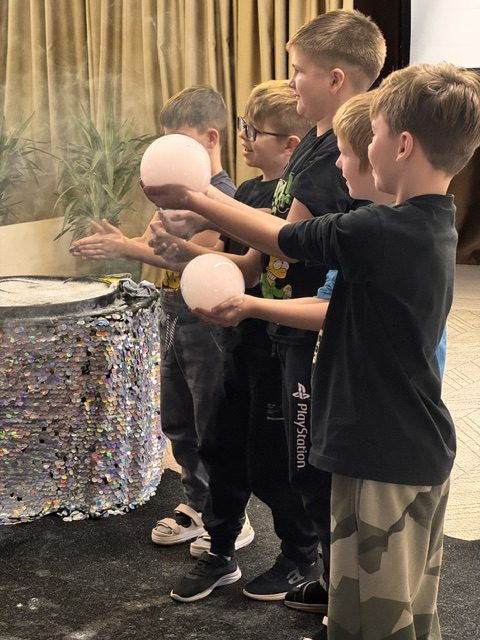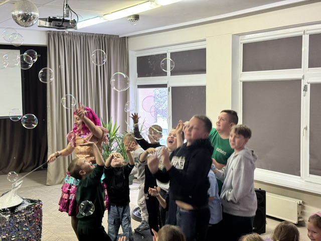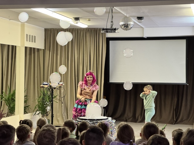 W Szkole-Przedszkolu w Skojdziszkach odbył się pokaz baniek mydlanych, który na długo pozostanie w pamięci dzieci. „Księżniczka” z zaczarowanej krainy zaprezentowała widowisko pełne efektów: ogromne i maleńkie bańki, przezroczyste, wypełnione mgłą, a nawet „ogniste”. Pokazowi towarzyszyła rytmiczna muzyka, nadając wydarzeniu wyjątkowy klimat i jeszcze bardziej angażując młodych widzów. Dzieci z zachwytem śledziły każdy moment tego magicznego spektaklu.