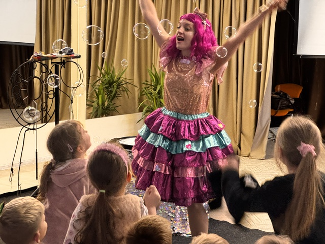 W Szkole-Przedszkolu w Skojdziszkach odbył się pokaz baniek mydlanych, który na długo pozostanie w pamięci dzieci. „Księżniczka” z zaczarowanej krainy zaprezentowała widowisko pełne efektów: ogromne i maleńkie bańki, przezroczyste, wypełnione mgłą, a nawet „ogniste”. Pokazowi towarzyszyła rytmiczna muzyka, nadając wydarzeniu wyjątkowy klimat i jeszcze bardziej angażując młodych widzów. Dzieci z zachwytem śledziły każdy moment tego magicznego spektaklu.